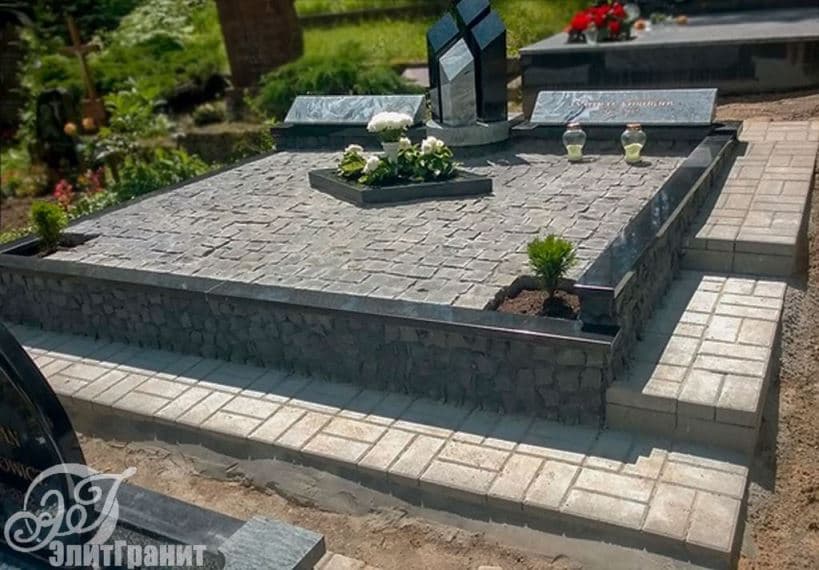 2 стелы, 4 столбика со срезом, 2 постамента, цветник