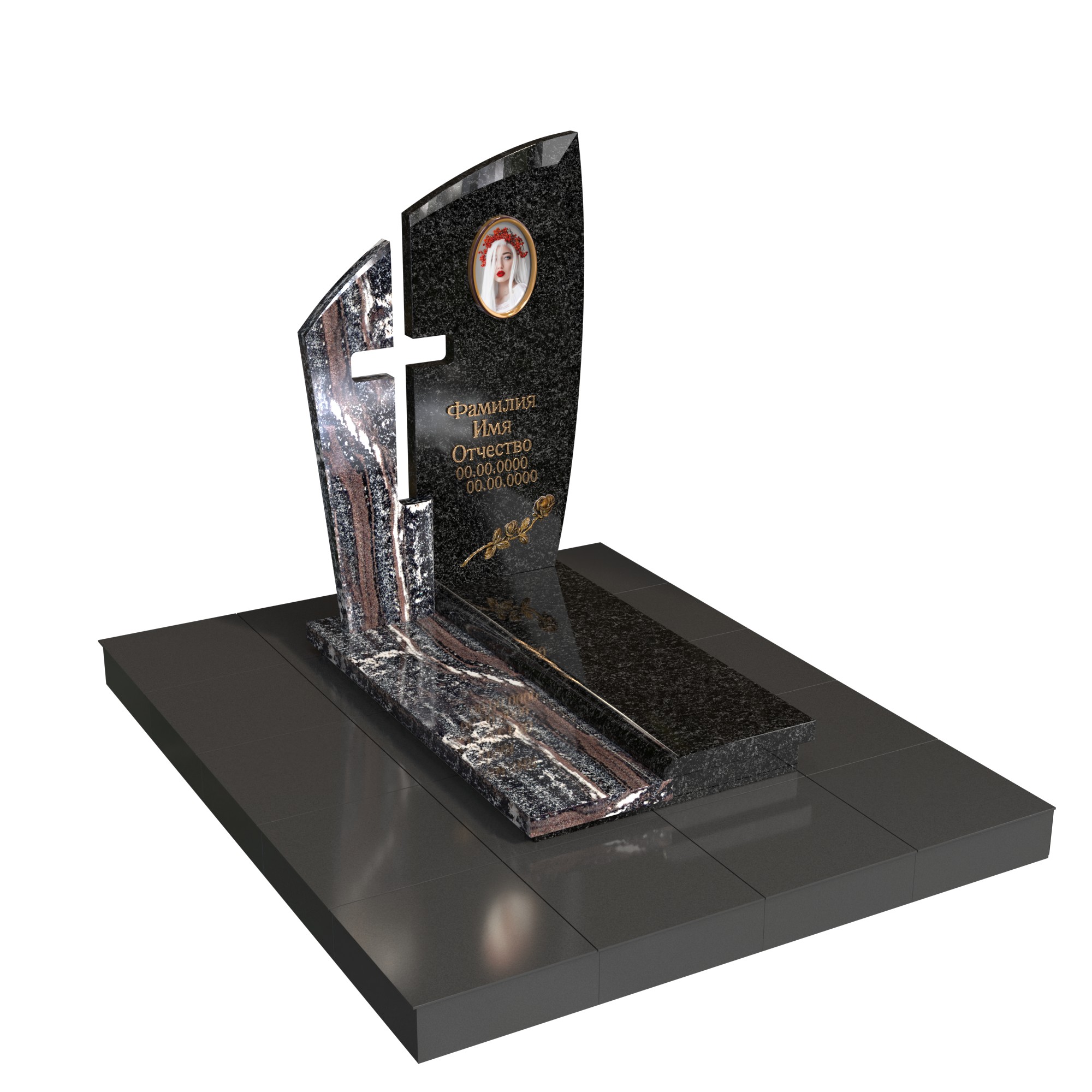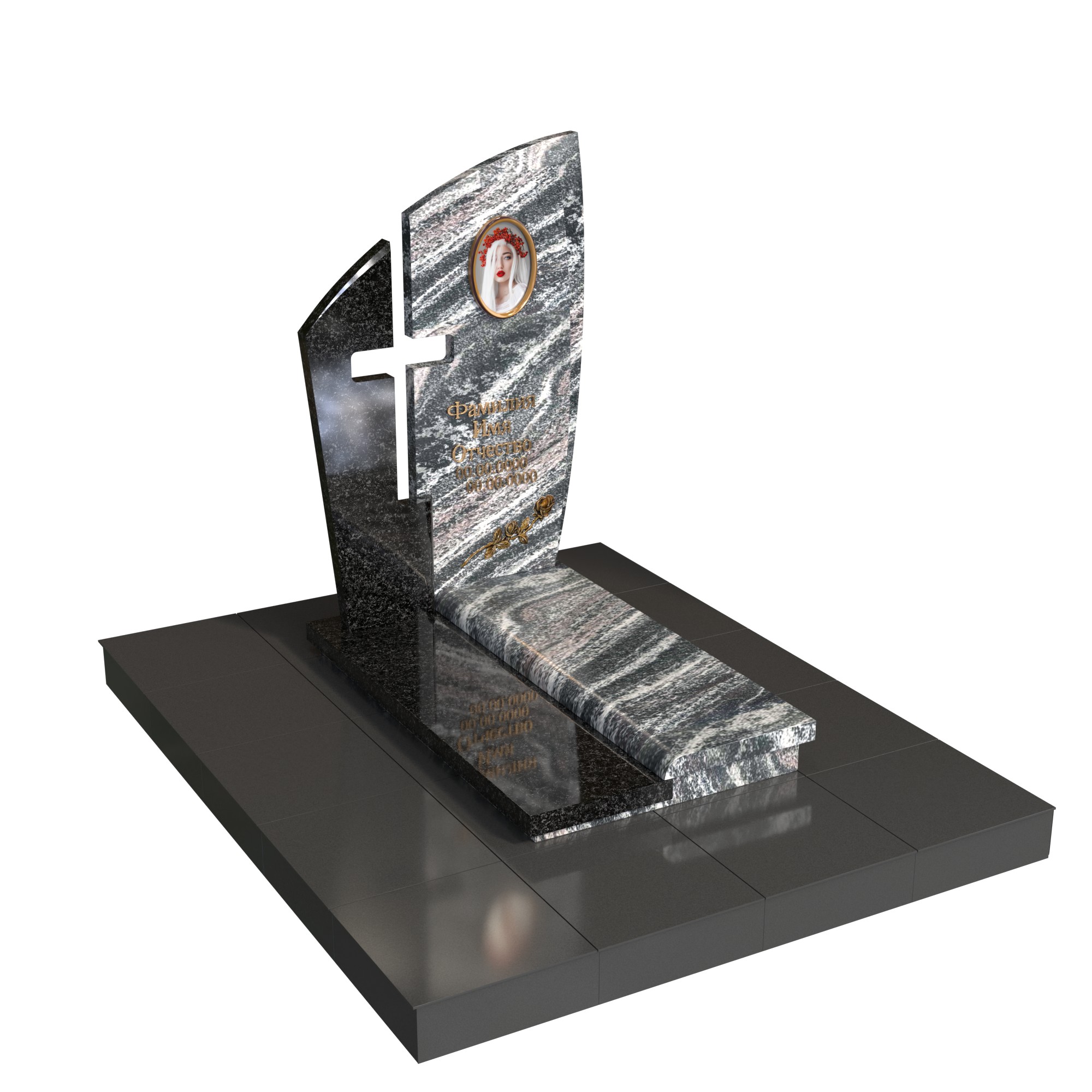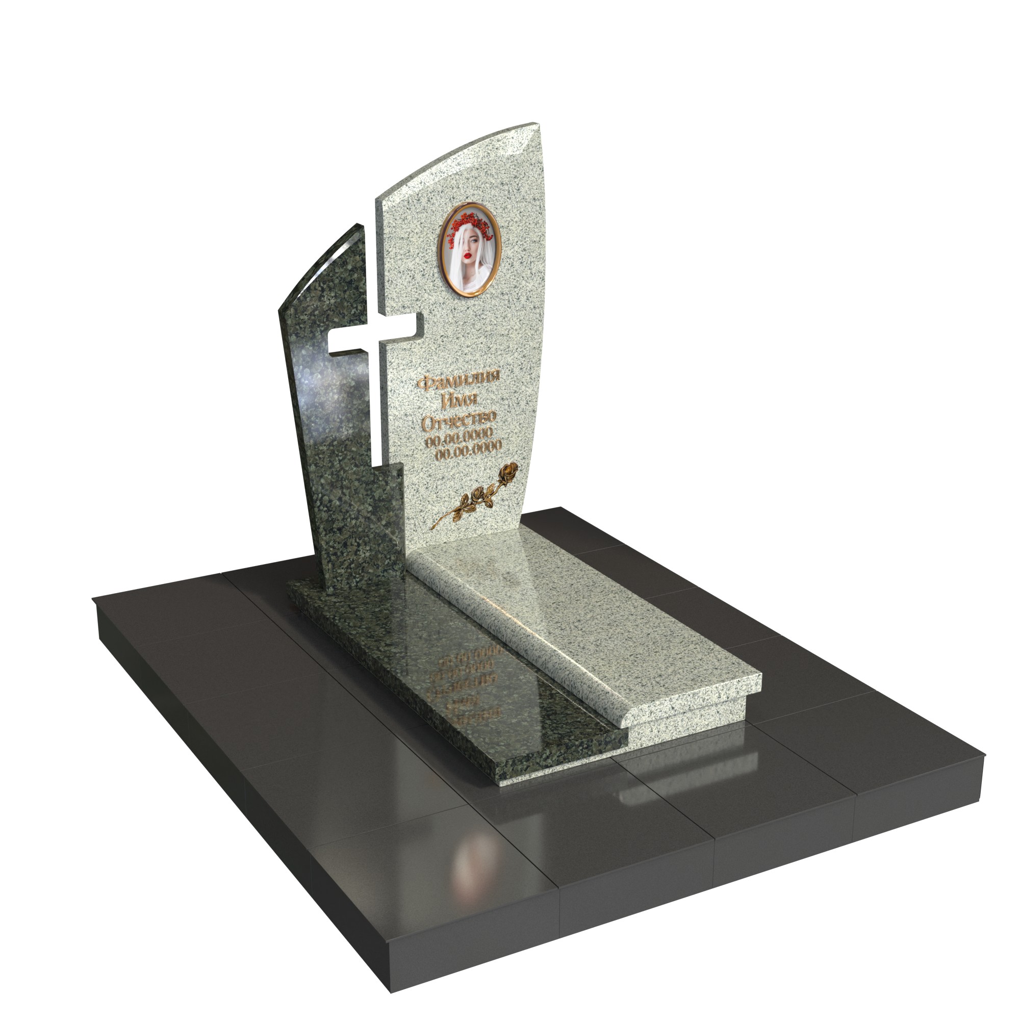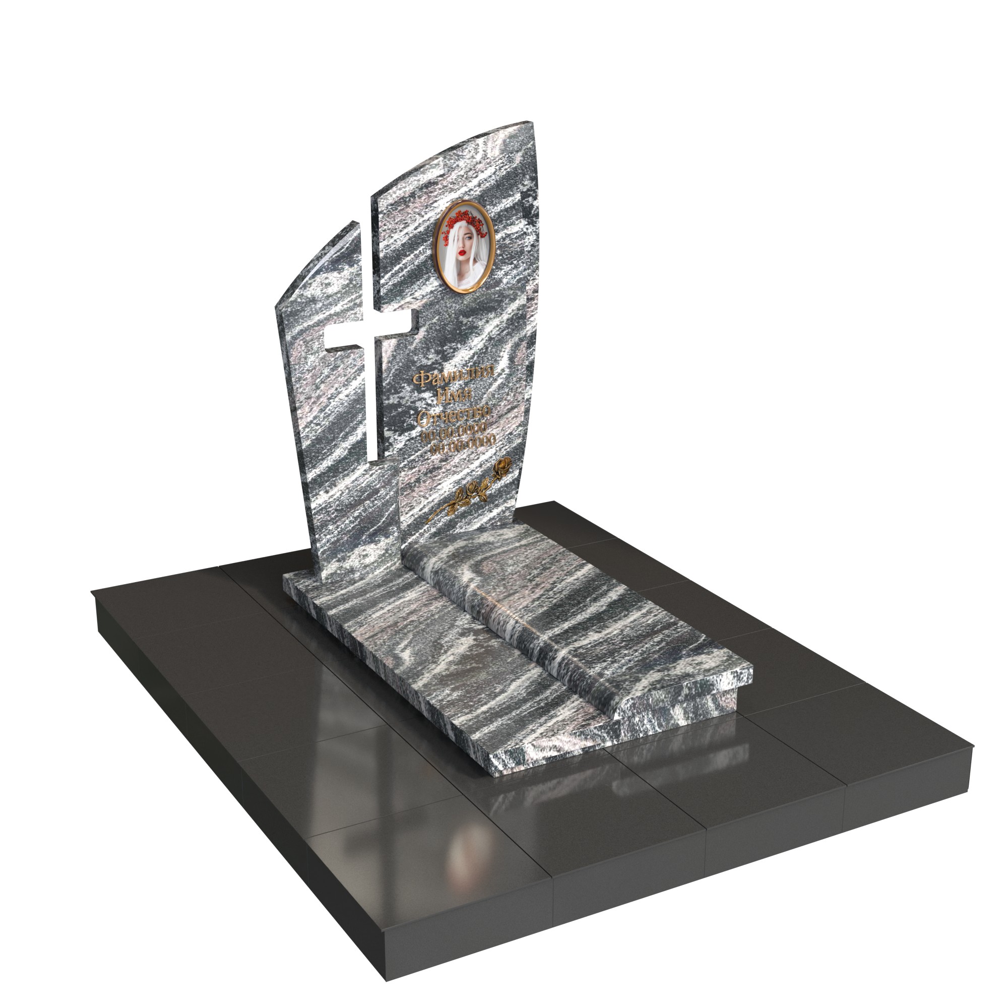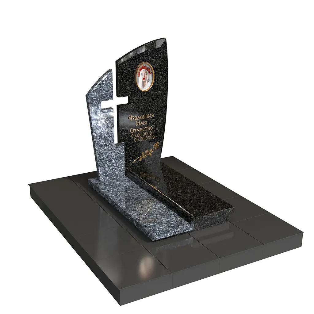 Памятник «Крест надежды» — современная модель из натурального камня с двухслойной стелой. Передняя плоскость с плавным изгибом и задняя контрастная часть образуют прорезной крест, символ веры и защиты. В верхней зоне — овальный фотомедальон; на основании — вытянутая плита с аккуратным бортом, поддерживающим строгую геометрию.